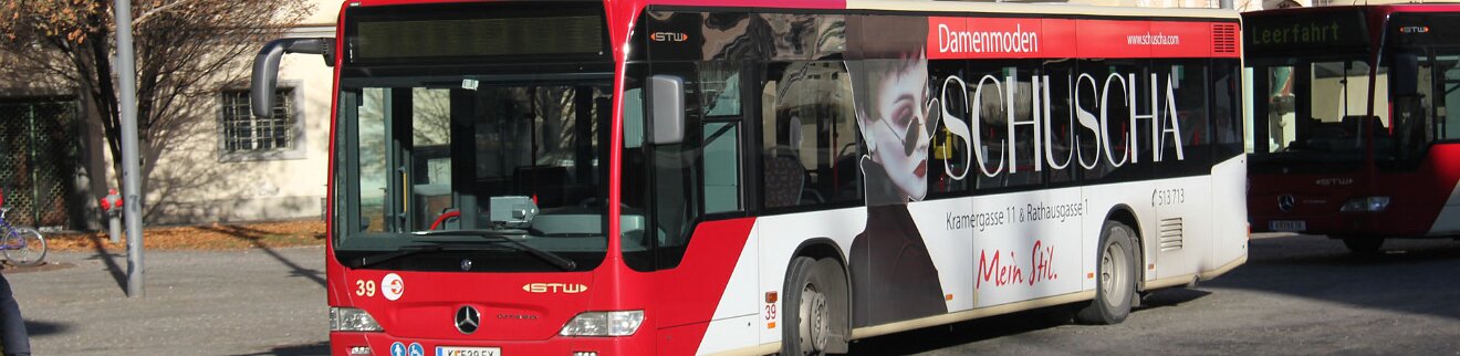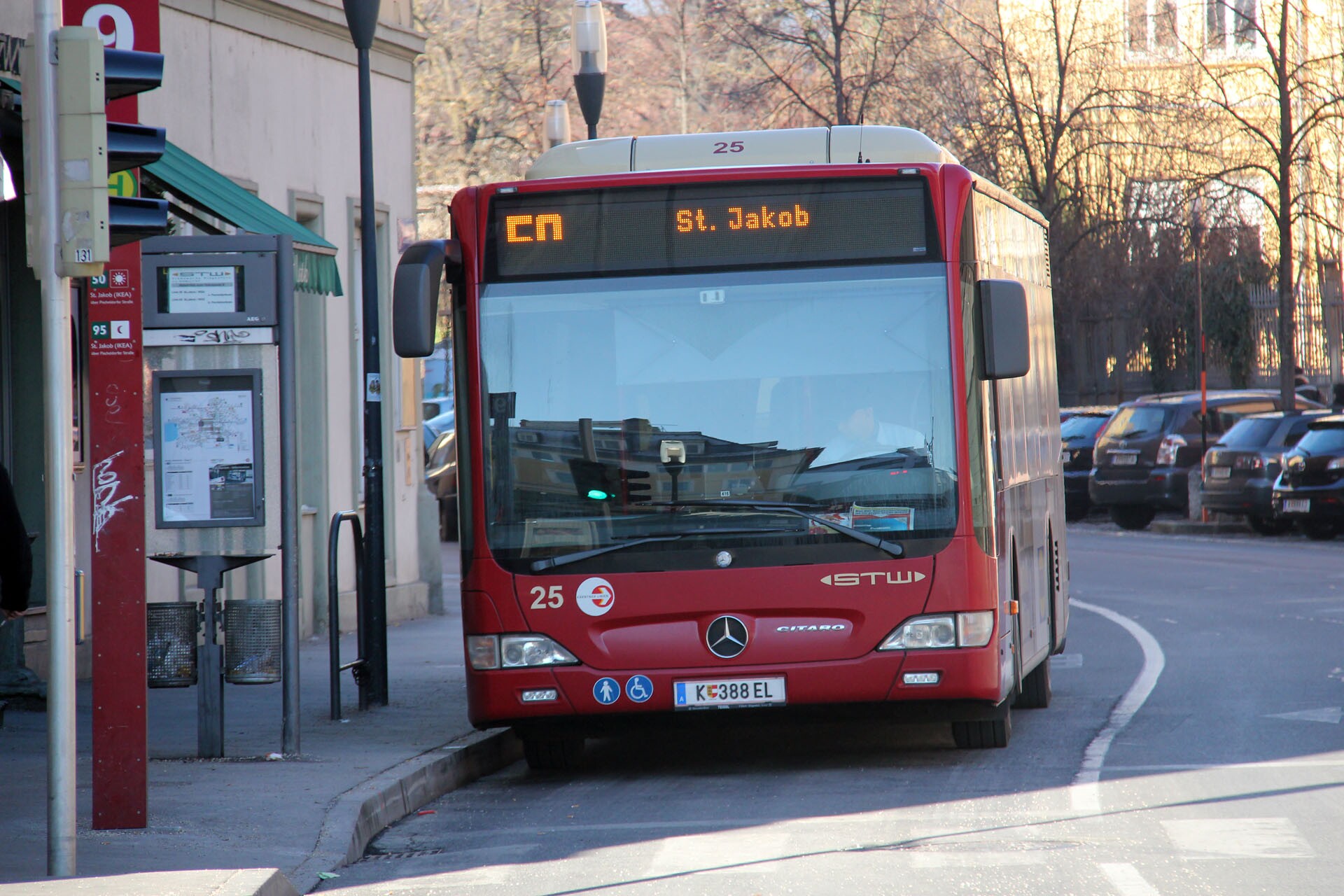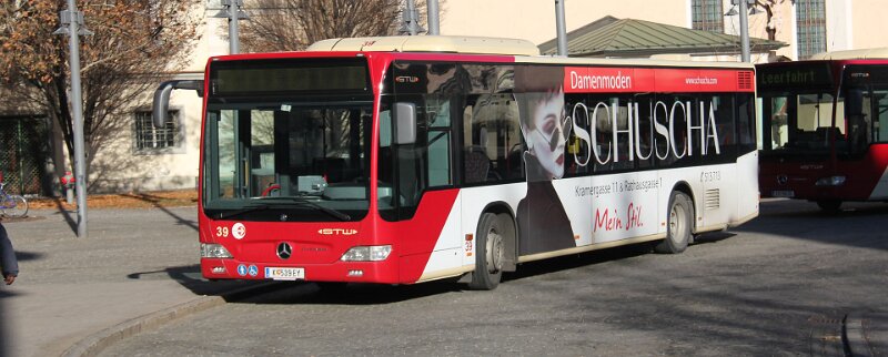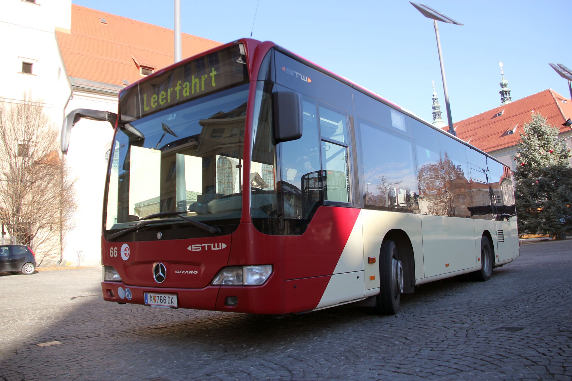 The fleet consists of Mercedes Citaros and the colours are red and beige. Most of them are Mercedes Citaro facelifts.