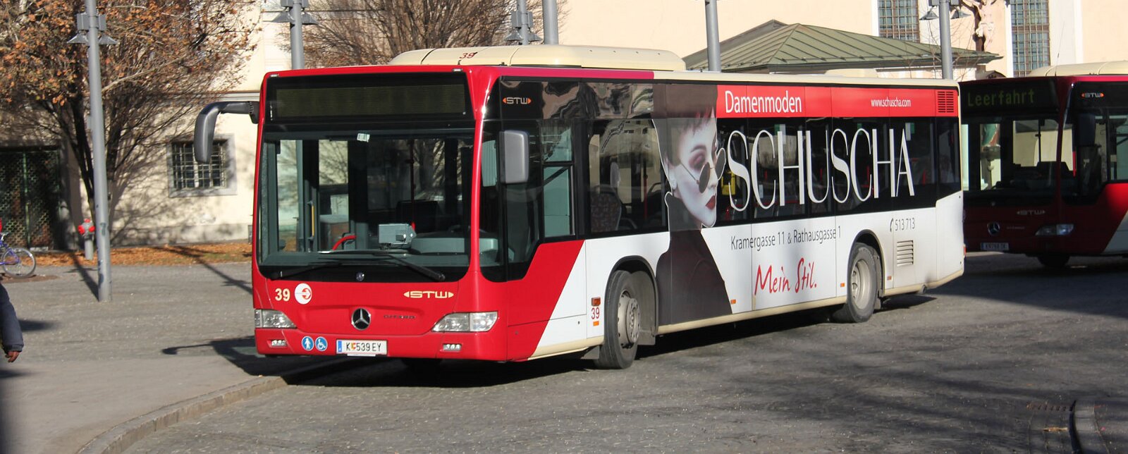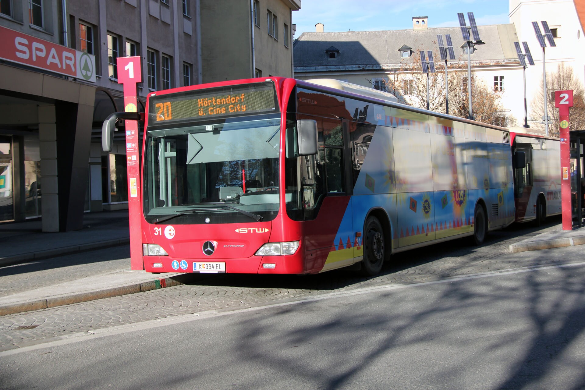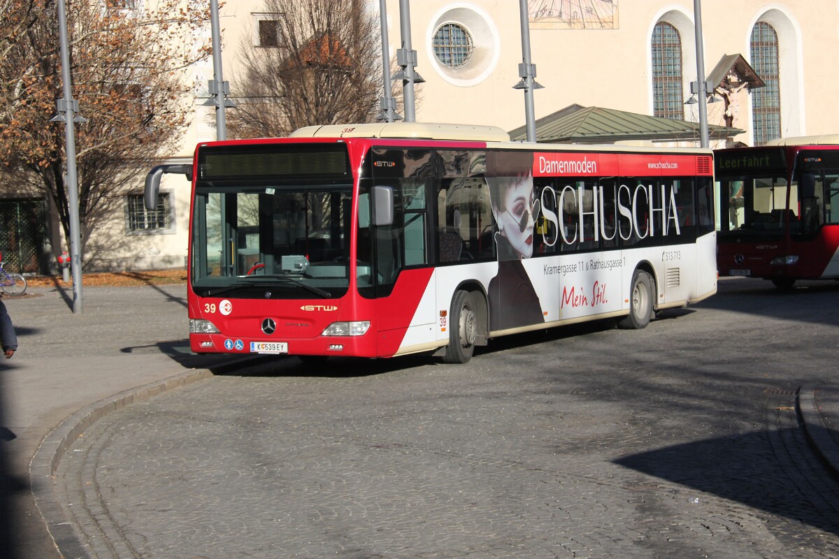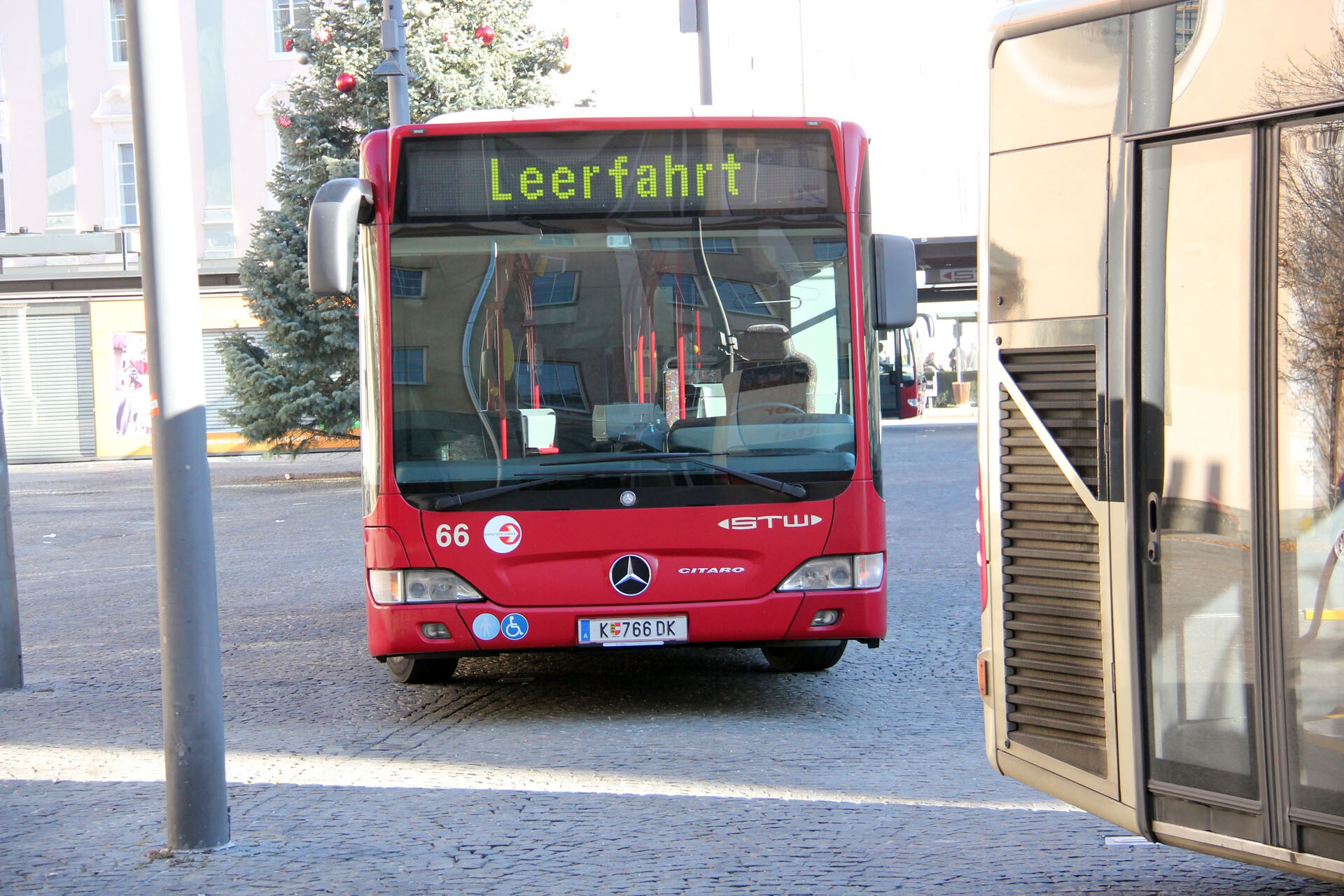 Die Flotte besteht aus Mercedes Citaros und die Farben sind rot und beige. Meist handelt es sich um Mercedes Citaro Facelift.